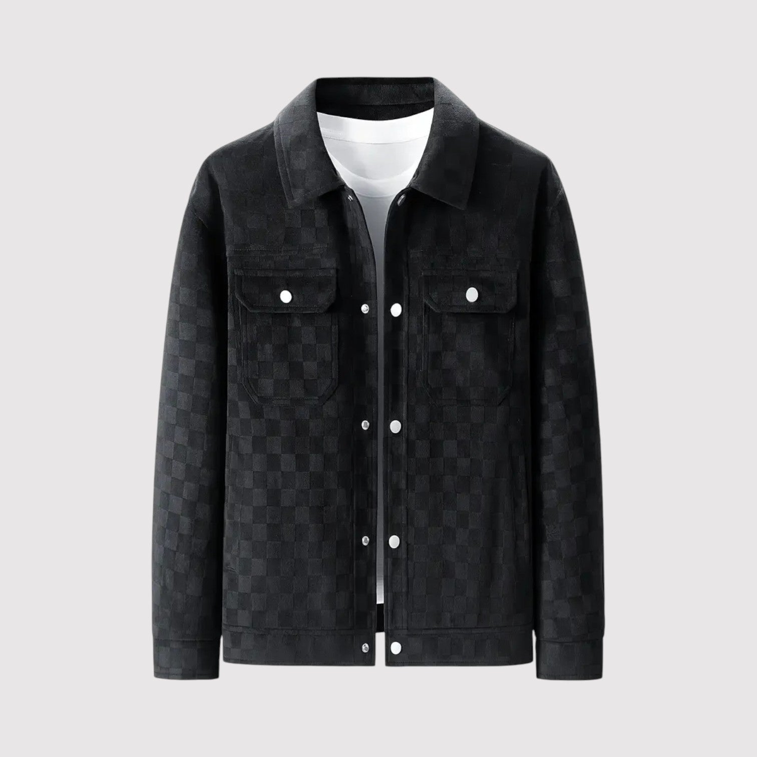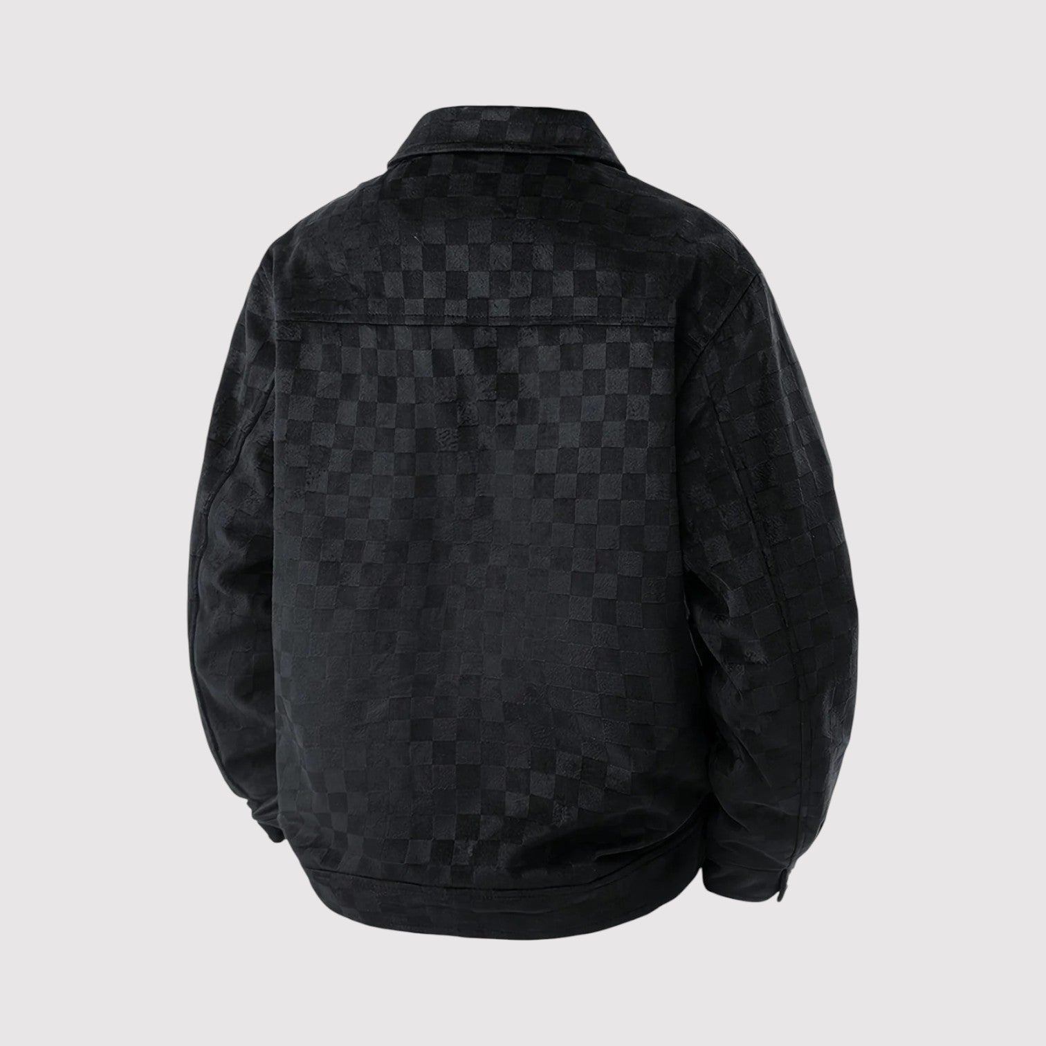控えめな自信を纏える、洗練されたブラックチェックジャケット。落ち着いた柄と構築的なシルエットがモダンな印象を与えつつ、時代を超えるスタイルを演出します。華美さを求めず存在感を大切にする大人の男性に最適です。