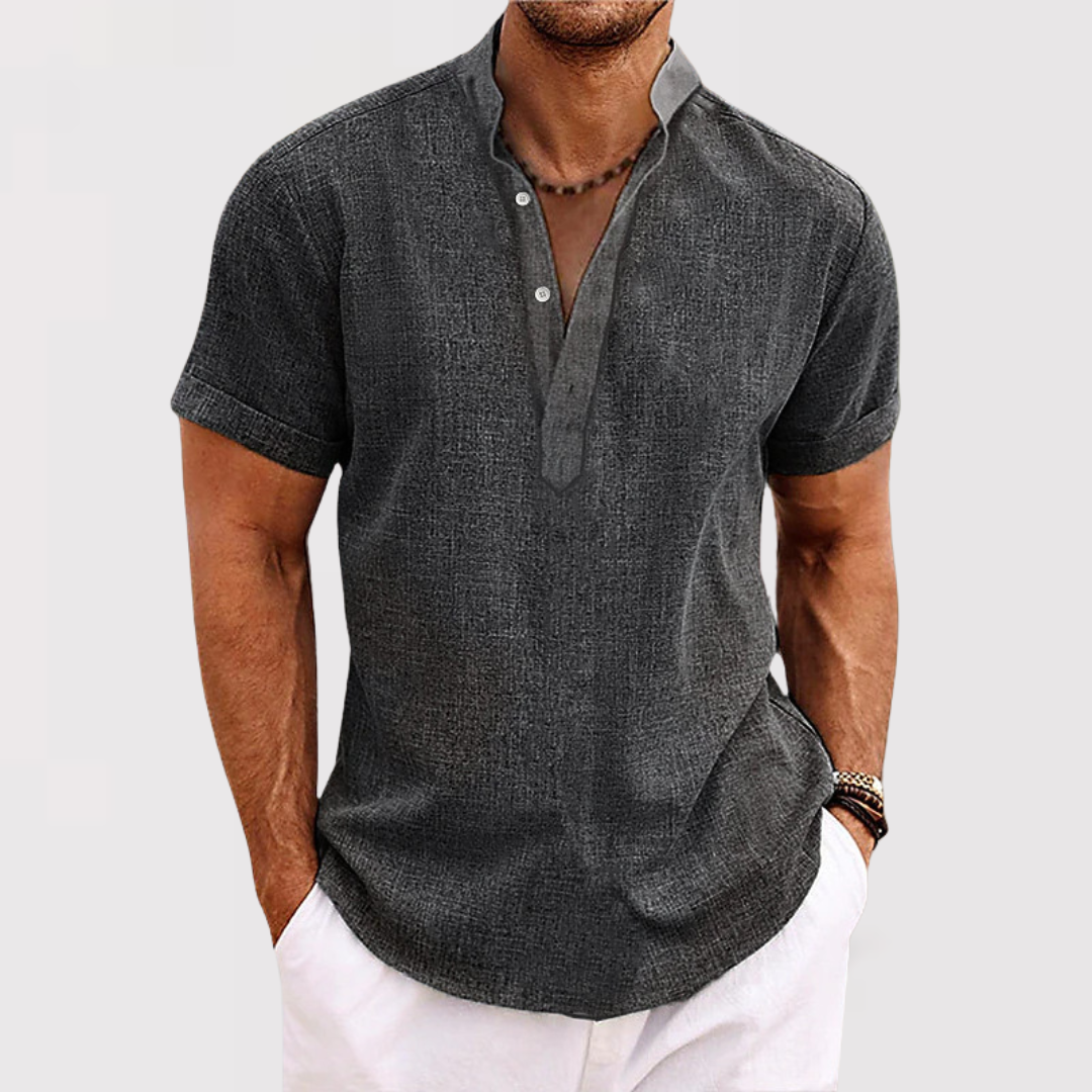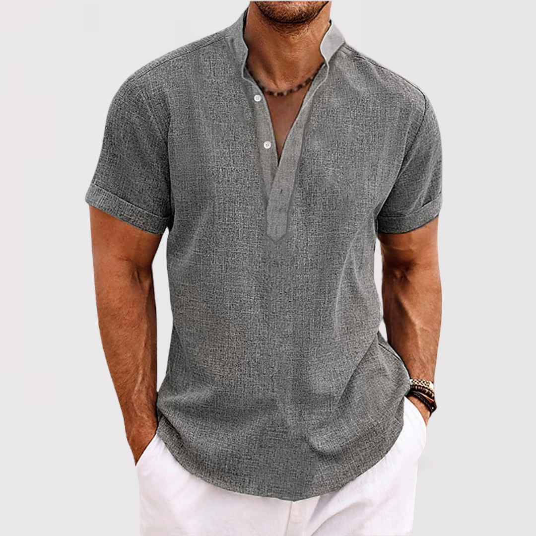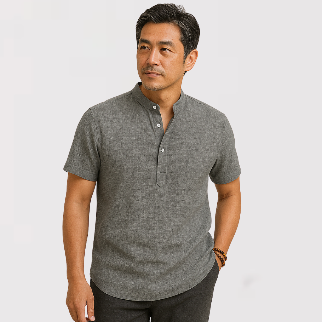 洗練されたスタイルを手軽に楽しめる、現代の男性のための半袖ヘンリーネックシャツ。