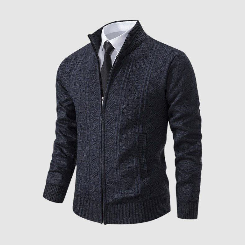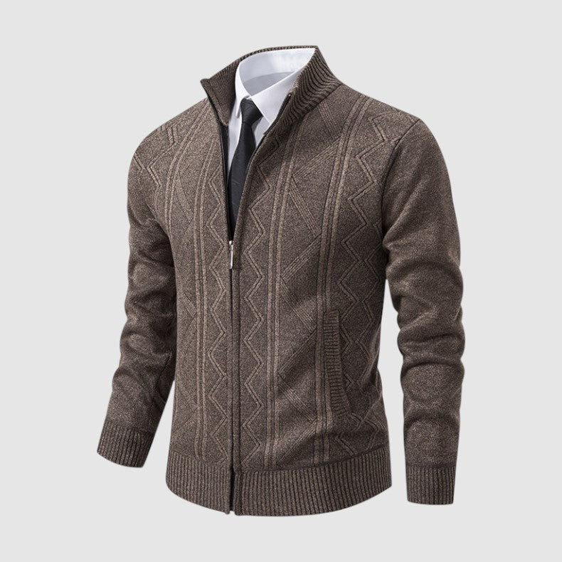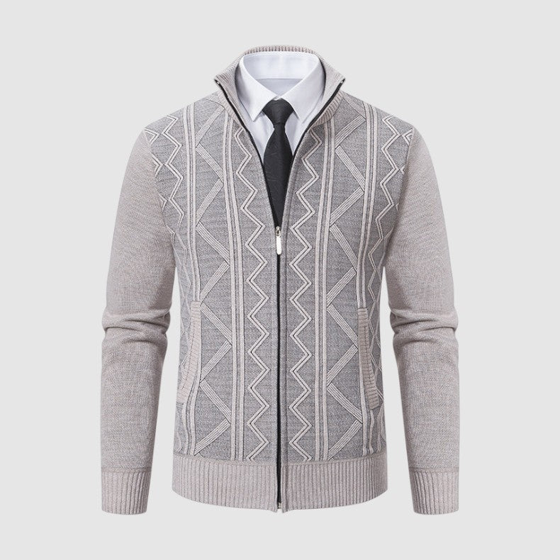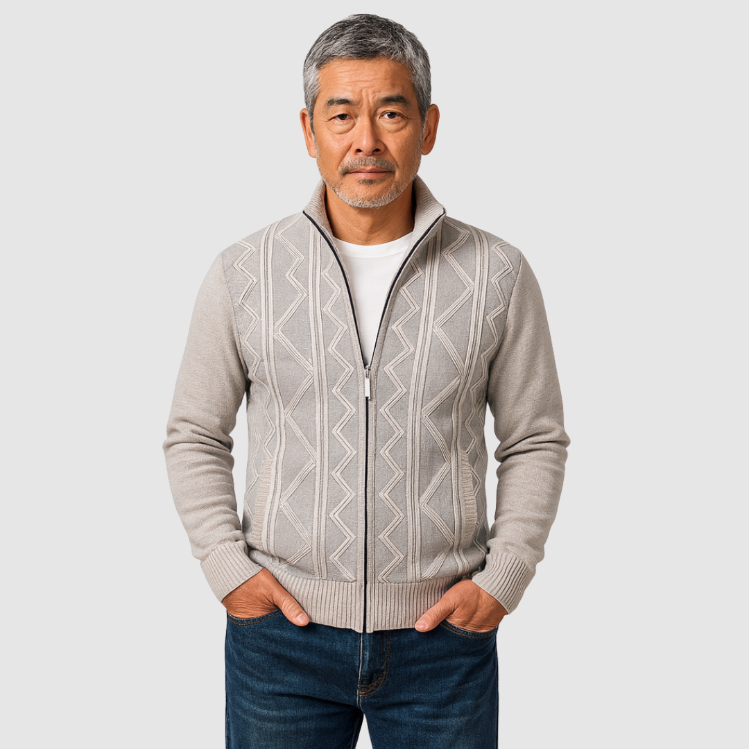 スタイルと快適さを見事に調和させた一着。幾何学模様の上品な編み地と、シックなジップアップデザインが、ビジネスから休日までシーンを選ばず活躍します。