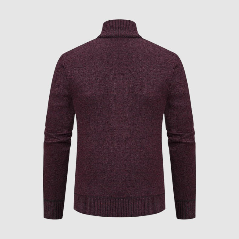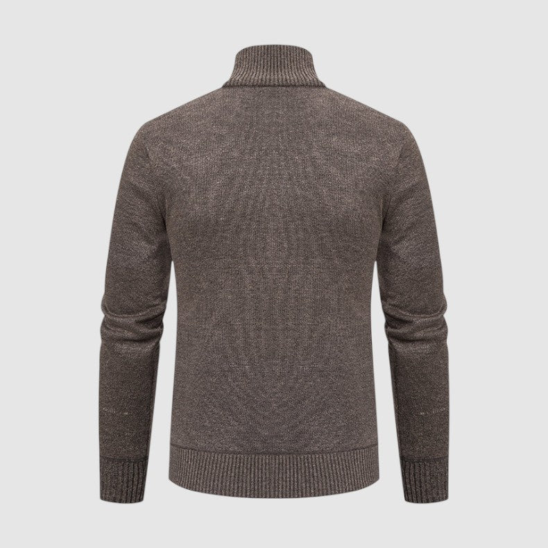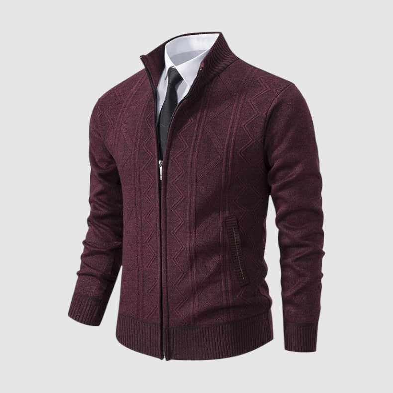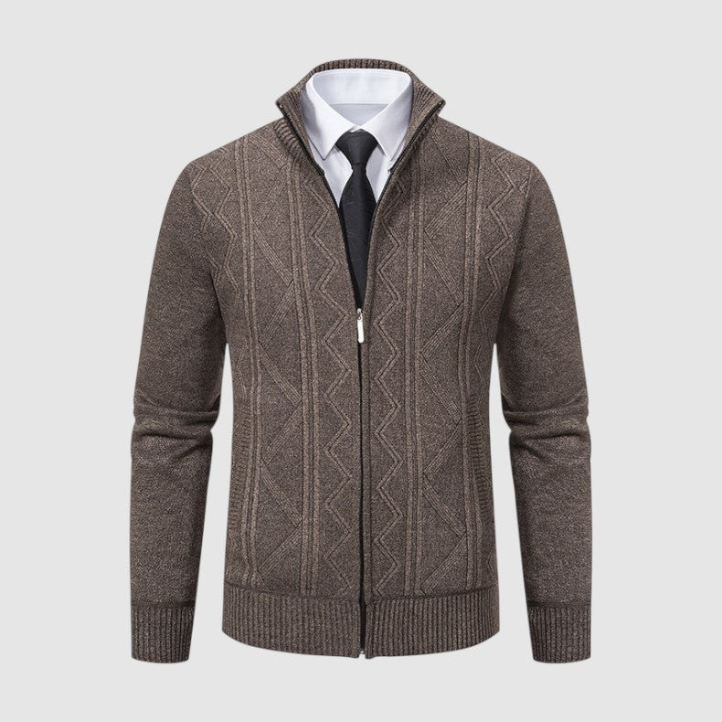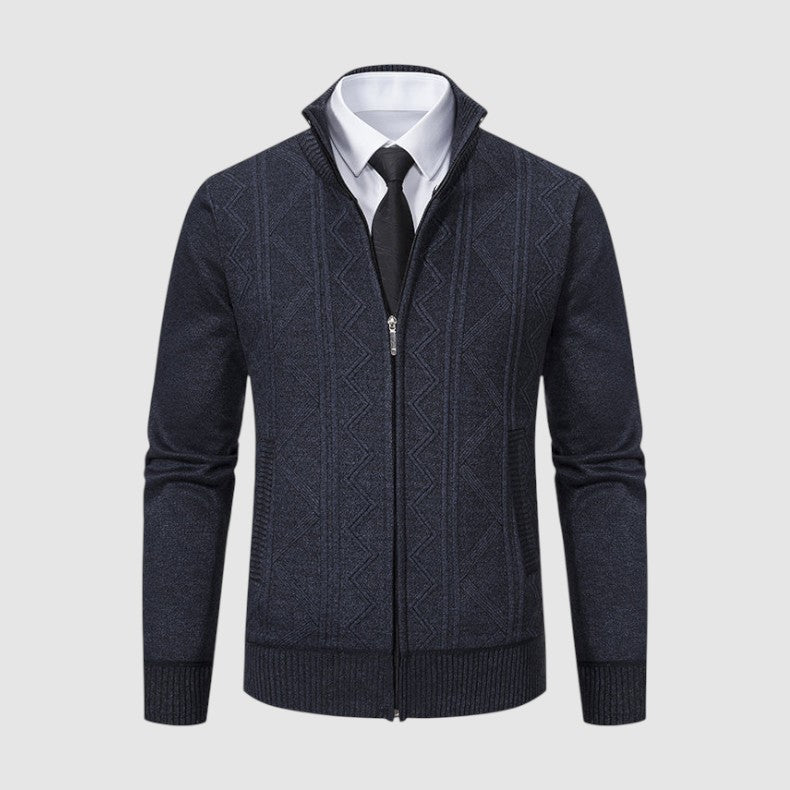スタイルと快適さを見事に調和させた一着。幾何学模様の上品な編み地と、シックなジップアップデザインが、ビジネスから休日までシーンを選ばず活躍します。
